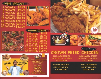 Fayetteville, North Carolina, 28301Crown Fried Chicken Fayetteville is a beloved local spot that brings the comforting taste of Southern and Baltimore-style fried chicken to Fayetteville. Known for its generous